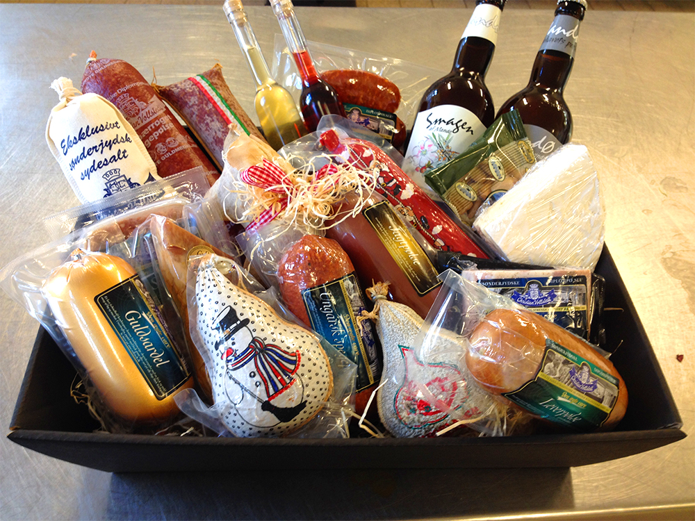 Lækre gavekurve/pakker med hjemmelavede produkter til jul. Denne gavekurv indeholder produkter for 1500 kr.