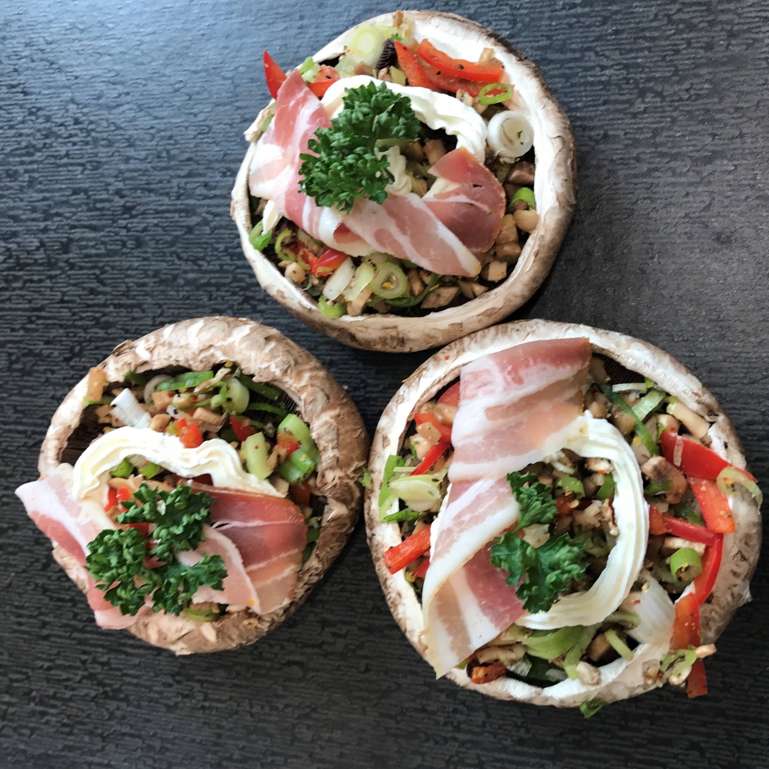 Portobello svamp, snittet porre, hvidløgssmør, bacon.