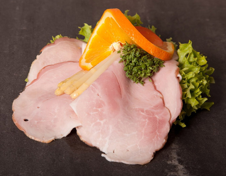 Luksus smørrebrød med skinke, asparges og italiensk salat, pyntet med årstidens grønt.