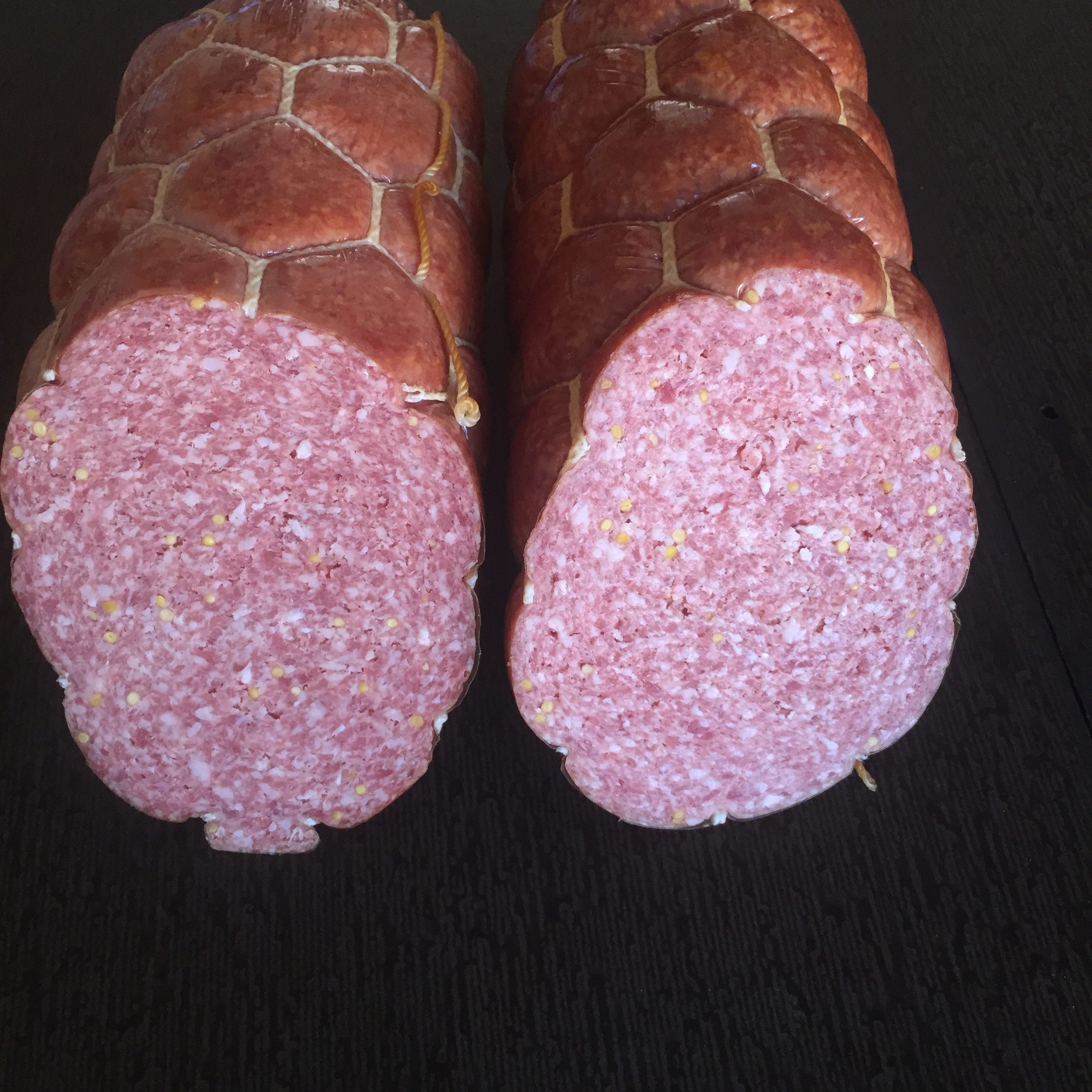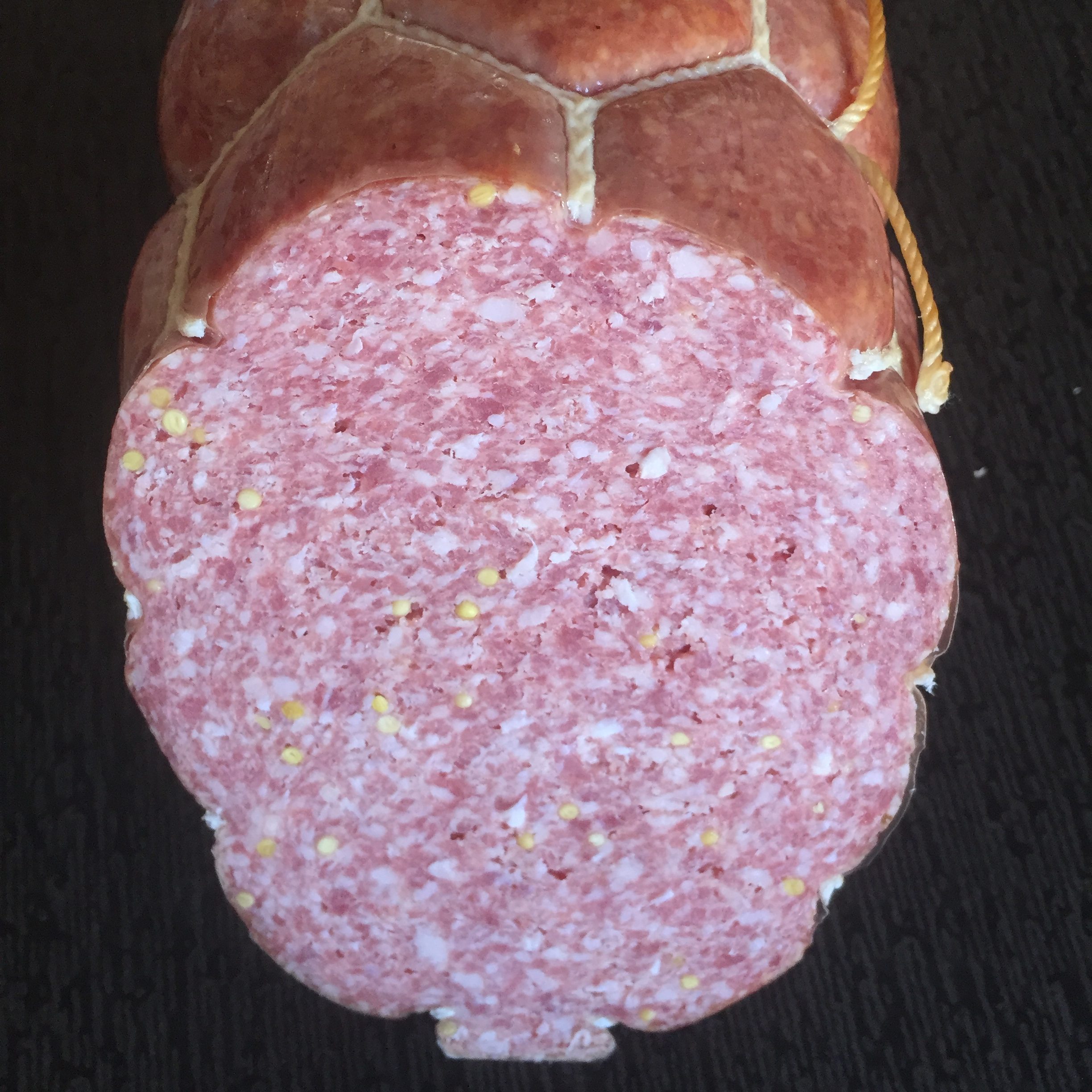 Spegepølse med sennepkorn er fremstillet af svinekød, oksekød og spæk, den er krydret med hele gule sennepkorn.